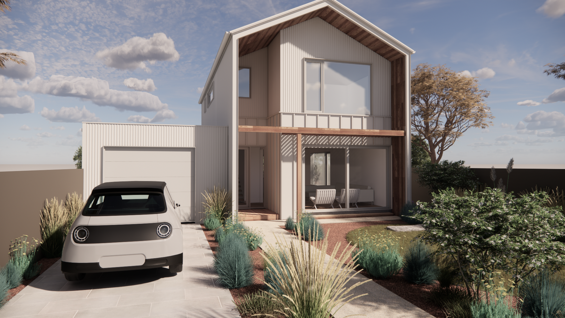 The layout includes an open-plan kitchen and living area, along with a bedroom and bathroom on the ground floor. Upstairs, the main sleeping wing features three bedrooms, a second bathroom, and a study nook. Originally optimised for a challenging north-facing site, the design can be adapted to suit other orientations. The two levels can also be flipped to create a reverse-living arrangement if desired.